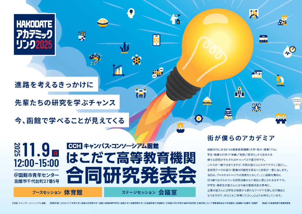 キャンパス・コンソーシアム函館(CCH)では、はこだて高等教育機関合同研究発表会「HAKODATEアカデミックリンク2025」を11月9日(日)に、函館市青年センターで開催します。